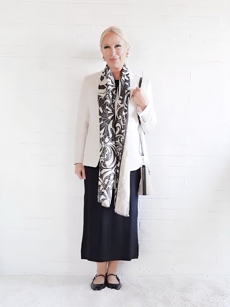 Wrinkle-Free Black Travel Dress + Beige Blazer (runs a size small) + Scarf (Similar) + Crossbody Handbag + Mary Jane Ballet Flats