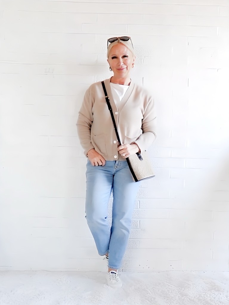 Crossbody Handbag + Canvas Sailing Sneakers + Boyfriend Jeans + White Layering Tank + Cashmere Cardigan (Similar)