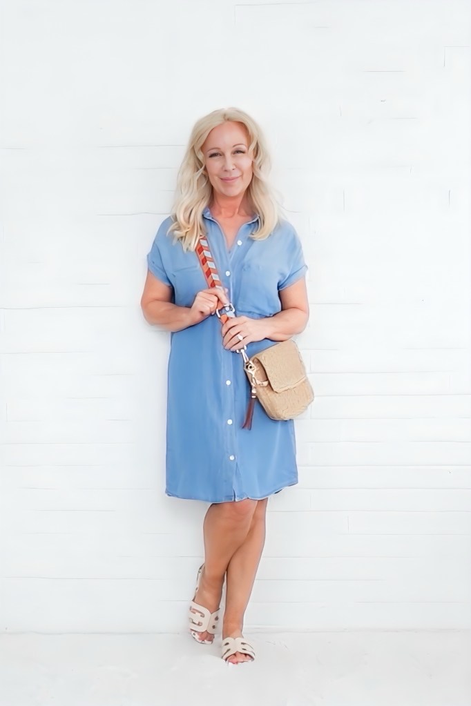 Chambray Shirt Dress + Crossbody Bag + Slide Sandals