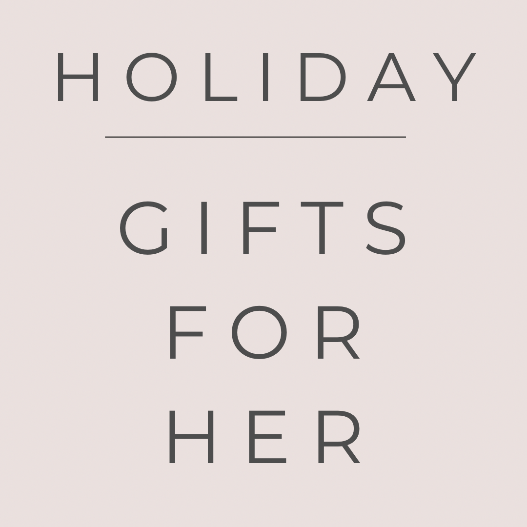 Text graphic with the words 'HOLIDAY GIFTS FOR HER' in bold lettering, set against a light pink background.