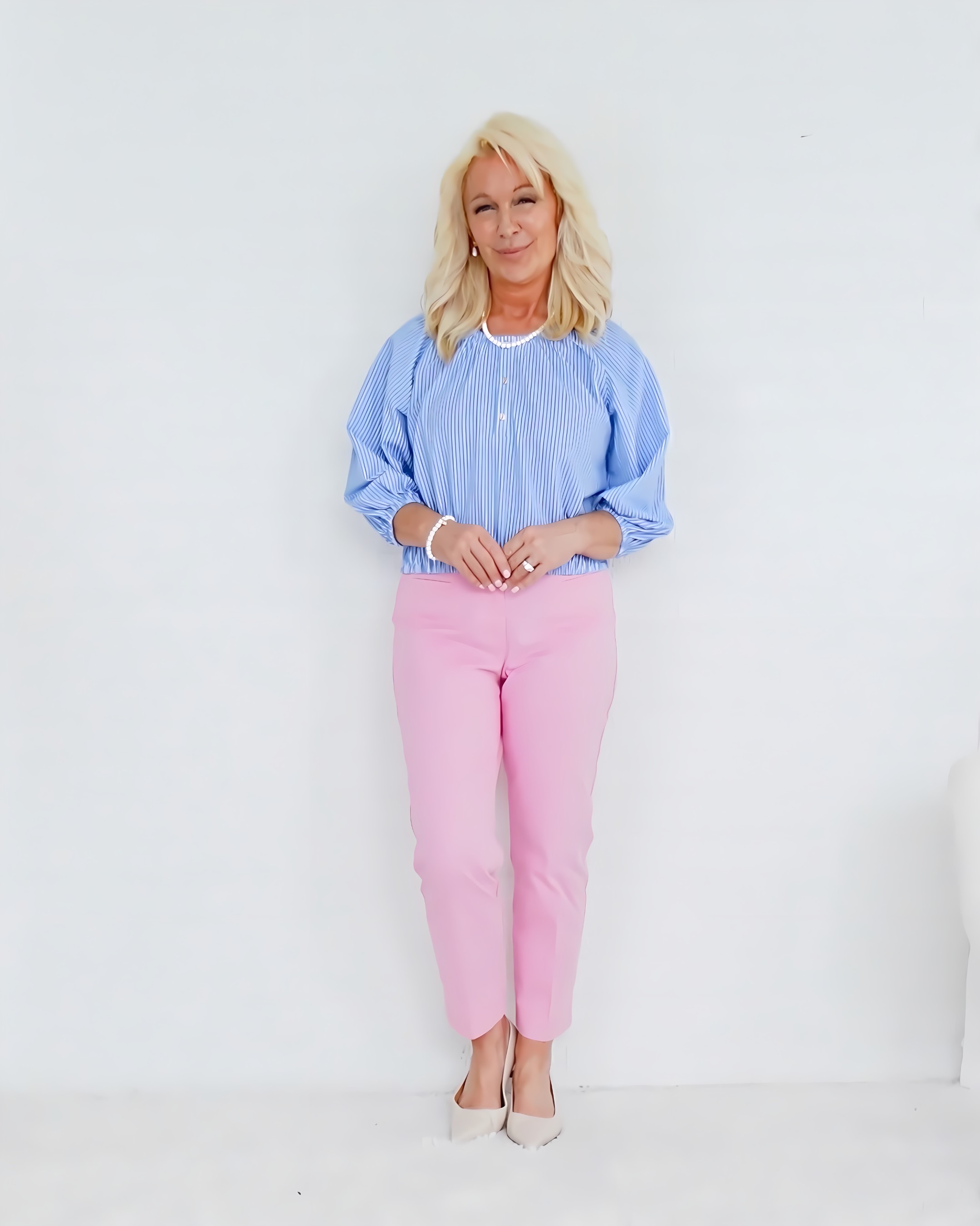 Blush Blazer Striped Button-Up Shirt AF Jeans Pearl Necklace